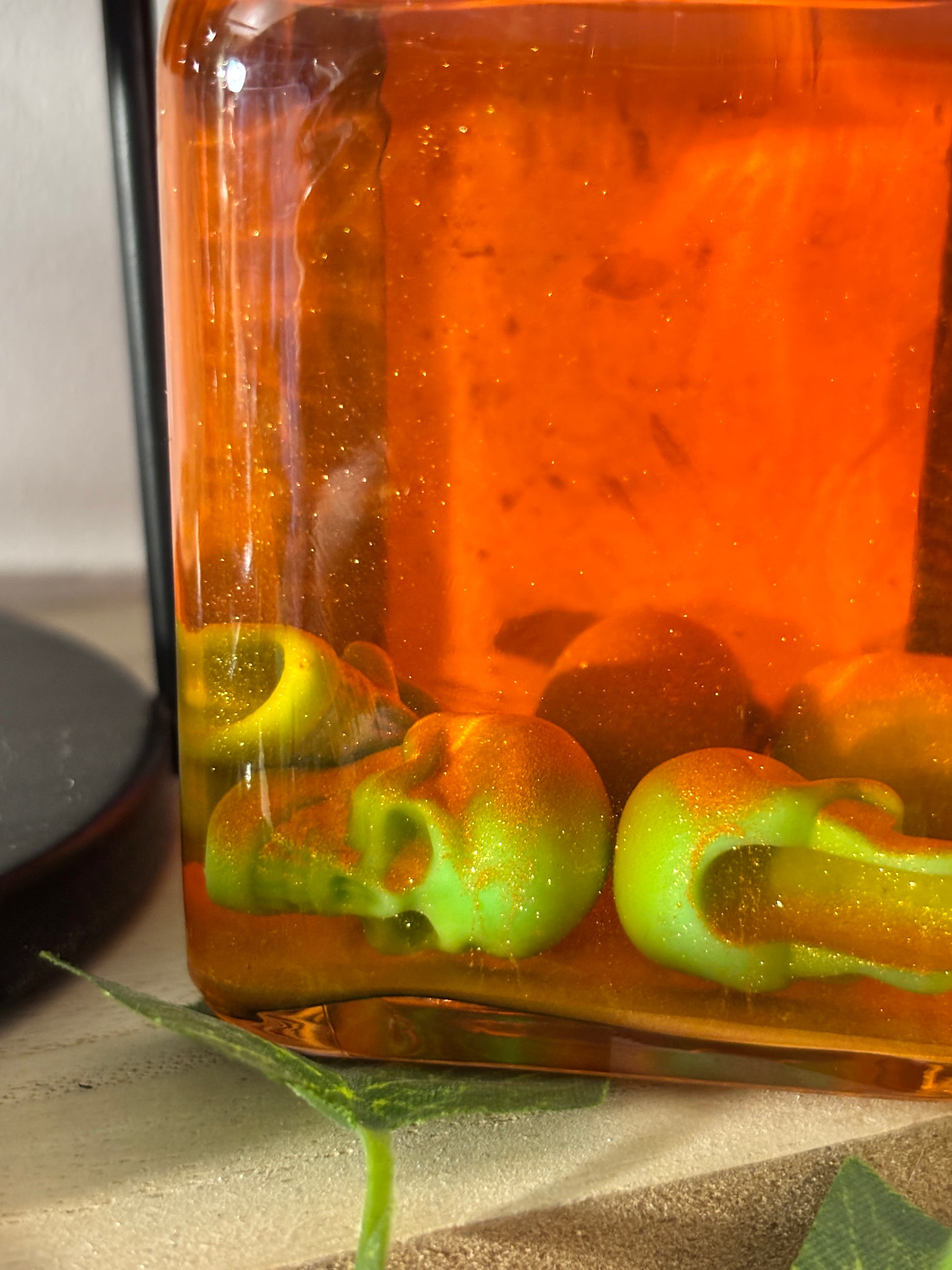 - Corde macramé noir, breloques crânes vert à l'intérieur de la potion, crâne citrouille sur le bouchon, cire doré, corde noir avec un sceau de cire tête de mort rouge, étiquette fait mains